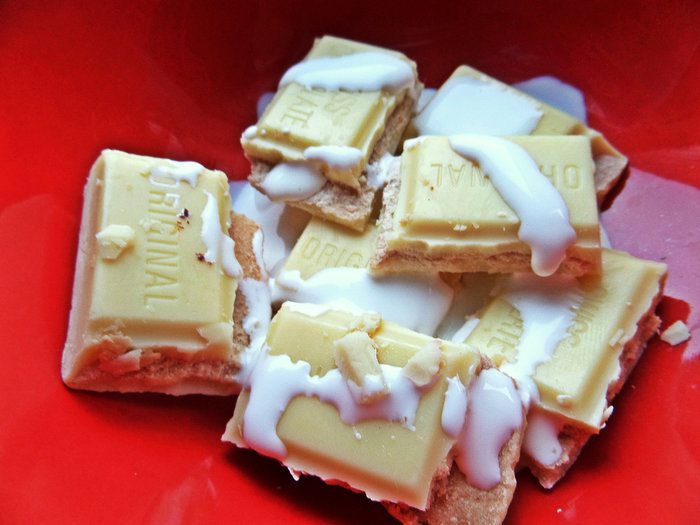 Влить сливки 1-2 ложки и поставить на водяную баню или в микроволновку.