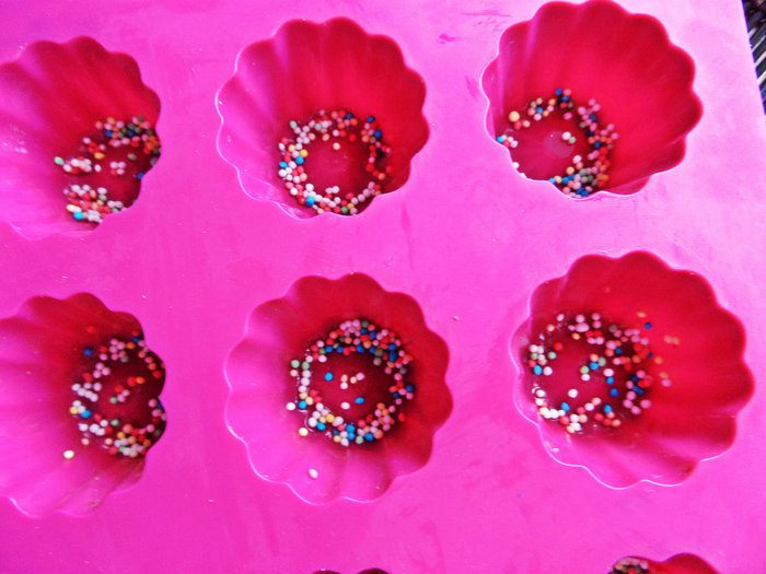 А вот снова нам в помощь силиконовая формочка для маффинов! На дно насыпать сахарную цветную крошку.