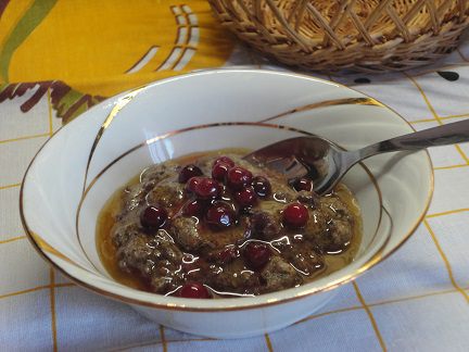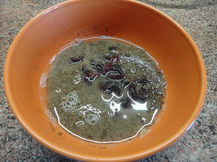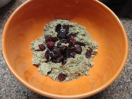 Три столовые ложки перемолоть в кофемолке, добавить клюкву или ваши любимые сухофрукты.