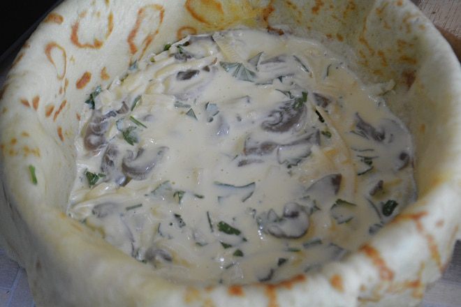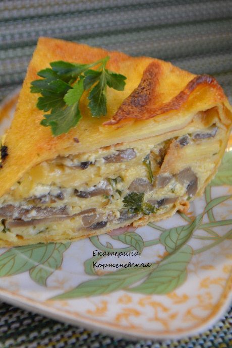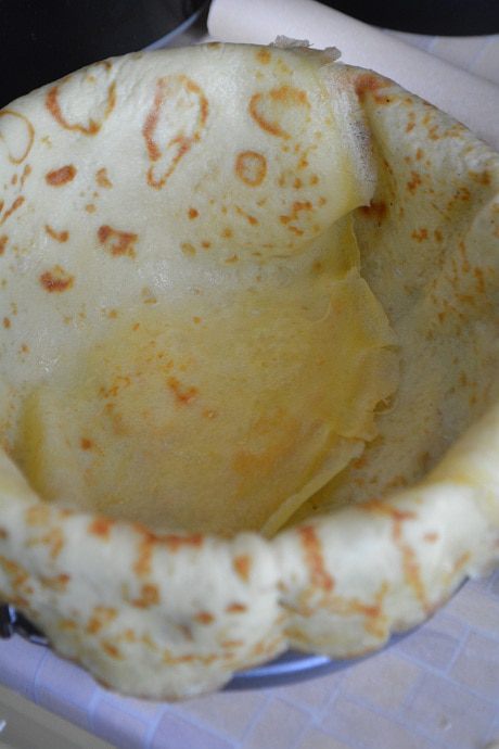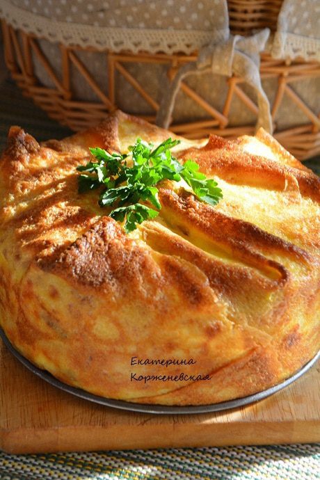 Выложить немного начинки, залить 2-3 ст. л. заливки.Накрыть блином, снова начинка, заливка и так до верха.