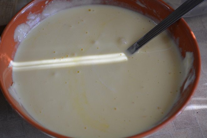 Готовим тесто для блинчиков. В миске смешать молоко, воду, сахар, соль, разбить 2 яйца, взбить венчиком. Всыпать постепенно муку, чтобы не было комочков. В самом конце влить растительное масло и размешать. Теперь можно выпекать блинчики.