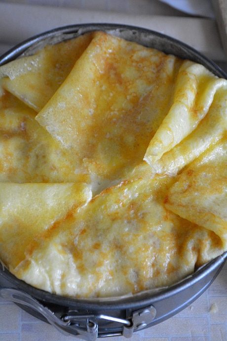 Собираем наш пирог: взять разъемную форму диаметром 18-20 см. Дно смазать маслом, бока застелить пекарской бумагой. Застелить блины внахлест друг на друга, чтобы края свисали.