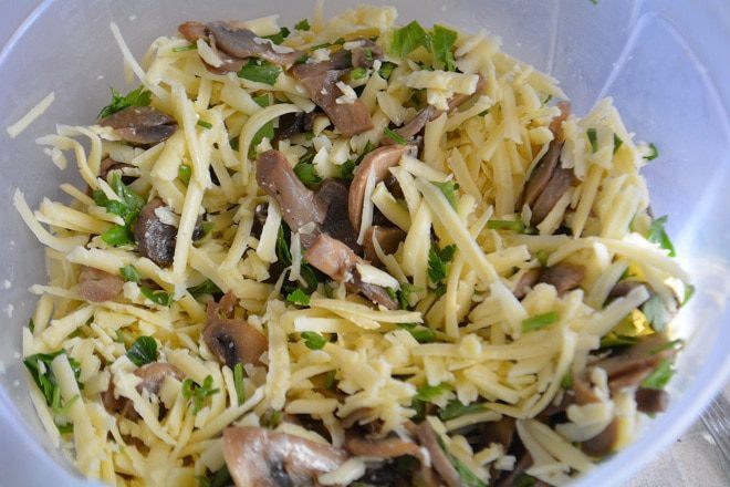 Тем временем готовим начинку для нашего пирога. Шампиньоны помыть, порезать пластинками и обжарить на сковороде с добавлением растительного масла в течение 10-15 минут. Посолить и поперчить. Остудить. Сыр потереть на крупной терке. Петрушку мелко нашинковать. Смешать грибы, сыр и петрушку.