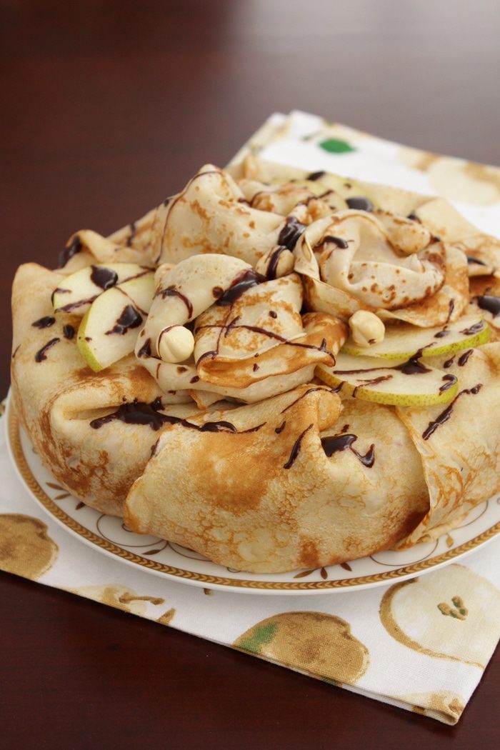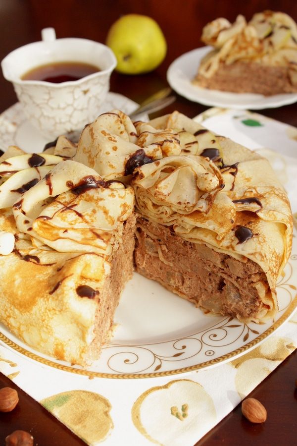 Блинный торт с шоколадным муссом, орехами и грушей