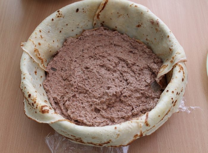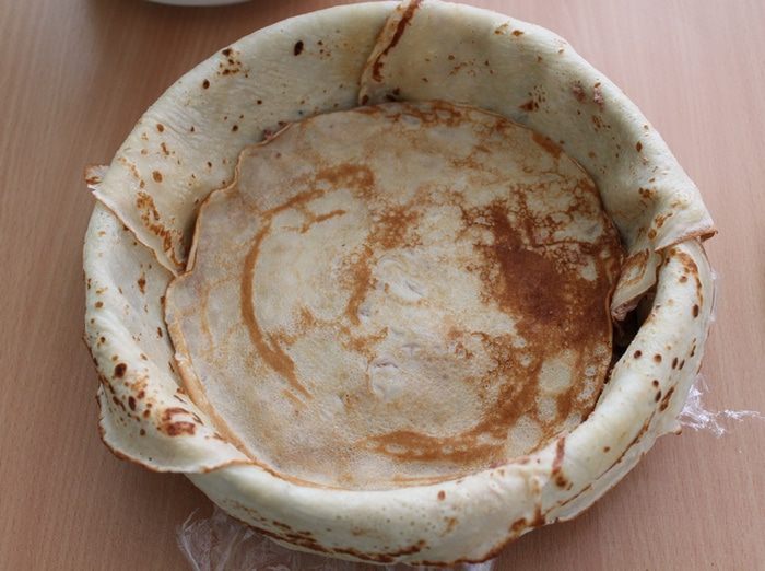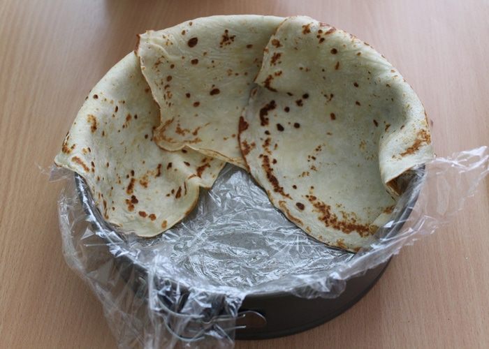 Форму 20 см проложить пищевой плёнкой, чтобы середина не была ею застелена и чтобы плёнка свисала по краям (я застелила всю форму и было трудно убрать пленку, не делайте так). Выложить в форму блины внахлёст, чтобы их края свисали из формы.