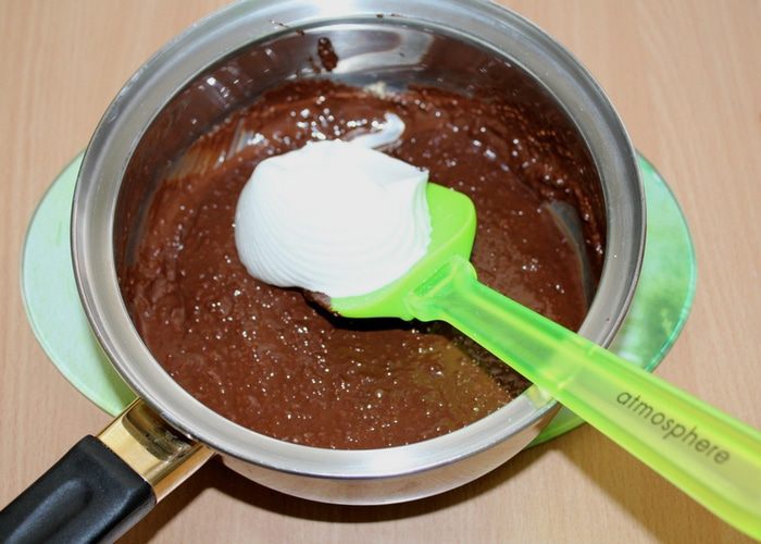 Первые порции сливок нужно быстро добавлять и перемешивать, чтобы шоколад не начал застывать от понижения температуры.