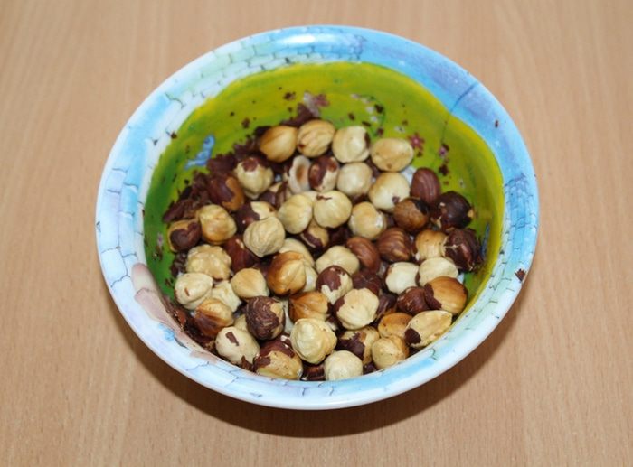 Фундук поставить в микроволновку на 750 г, минуты на 2 и прокалить их. После этого шелуха легко отделяется, для этого нужно просто потереть их пальцами.