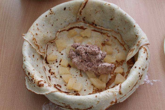 Затем завернуть свисающие края блинчиков. Из оставшихся блинов свернуть цветочки. Отправить в холодильник на 1-1,5 часа.
