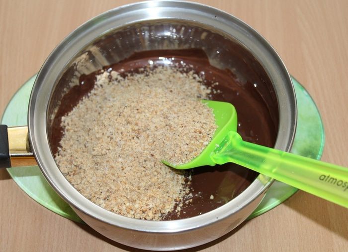 К шоколаду добавить орехи, перемешать.