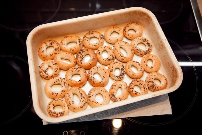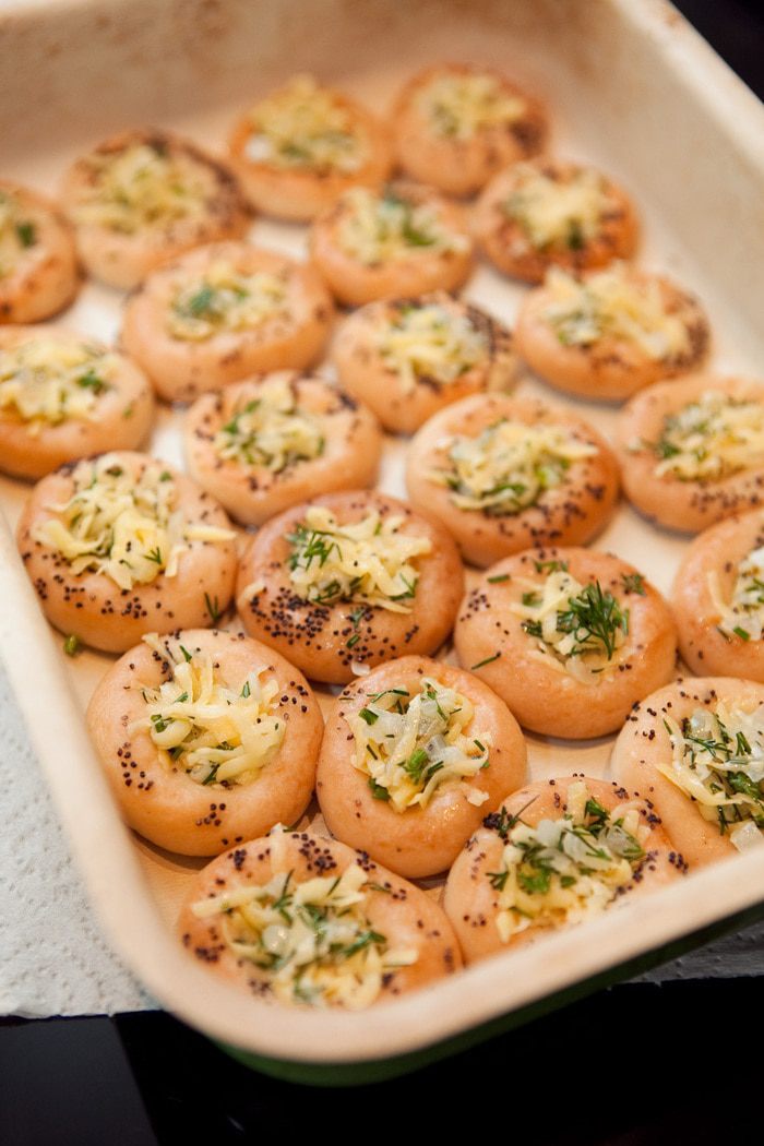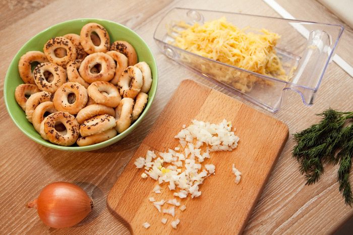 Сушки залить теплой кипяченной водой. Чем вода теплее, тем быстрее сушки впитывают воду и разбухают. Я оставляю на 10 минут. Тем временем натереть на крупной тёрке картофель, отжать лишнюю жидкость руками. Лук нарезать как можно мельче и обжарить на растительном масле до румяности. Укроп мелко нарезать.