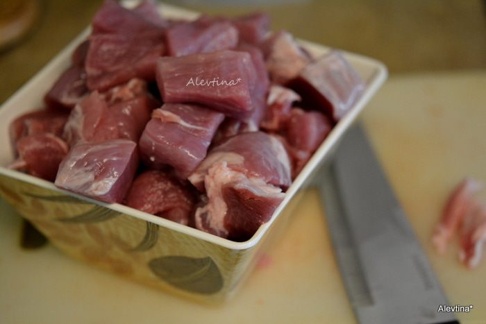 Свинину плечевая часть нарезать крупно кубиками.