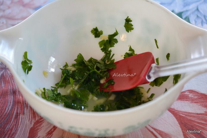 Нарезать свежую петрушку и выложить в глубокое стеклянное блюдо. Добавить лимонный сок, нарезанный чеснок.