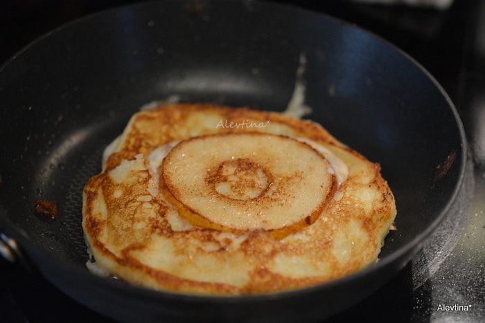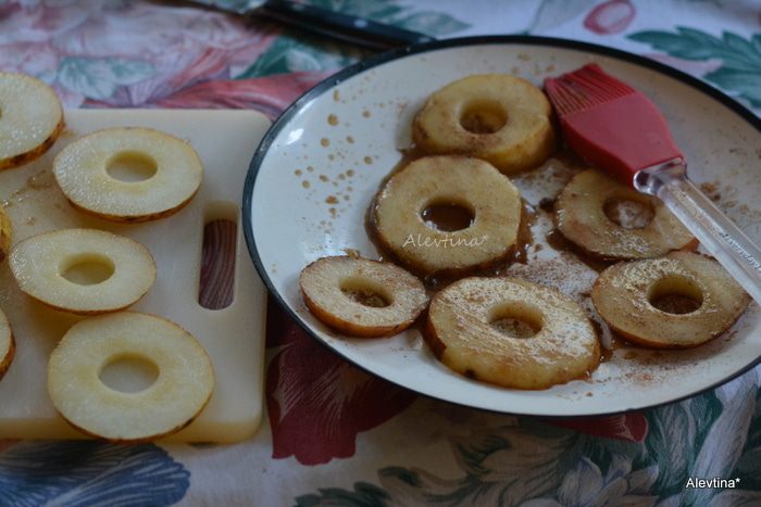В небольшом блюде смешать кленовый сироп с корицей. Выложить грушевые кольца в сироп. Смазать с обеих сторон с сиропом каждое кольцо.