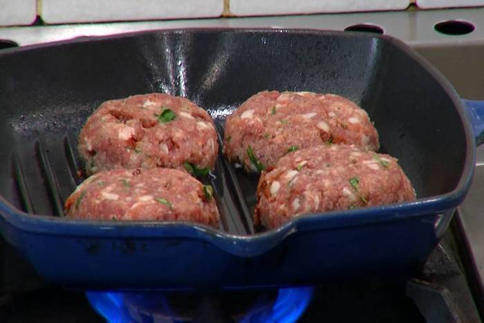 Разогреть в сковороде-гриль оливковое масло и пожарить котлеты с двух сторон до готовности.