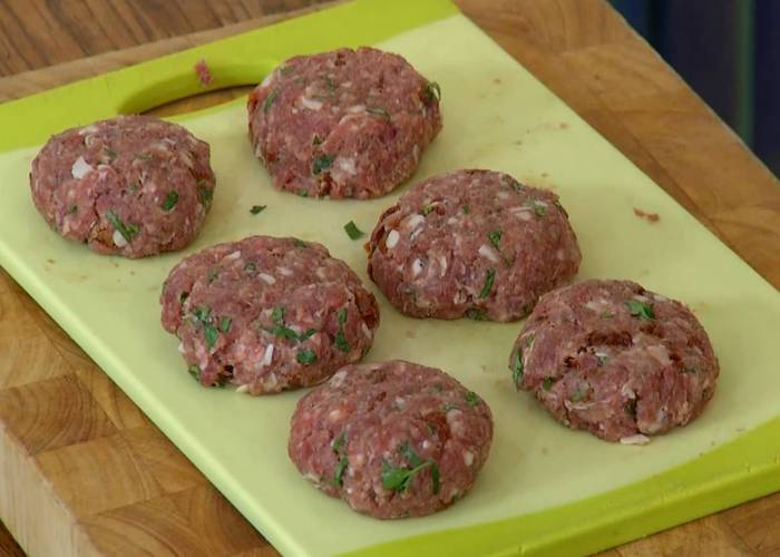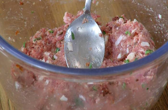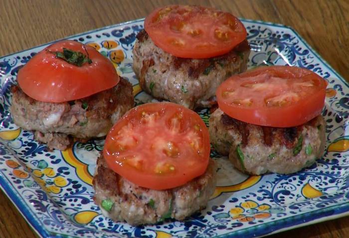 Рецепт интересный — в фарше вяленые помидоры, а сверху свежие. Готовый фарш хорошо подержать пару часов в холодильнике, но главное, чтобы он был однородным — должна получиться общая вкусовая композиция.