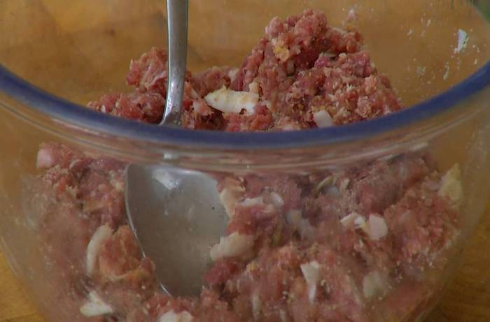 Натертый сыр соединить с фаршем, панировочными сухарями, добавить яйцо, посолить, поперчить и перемешать.
