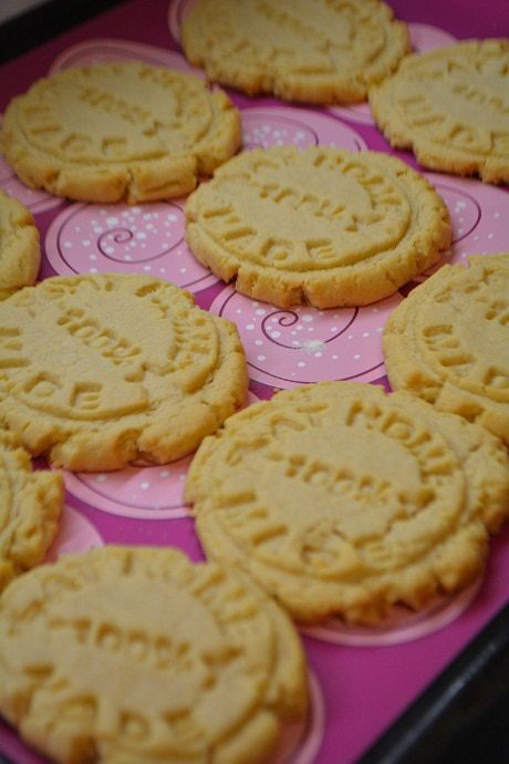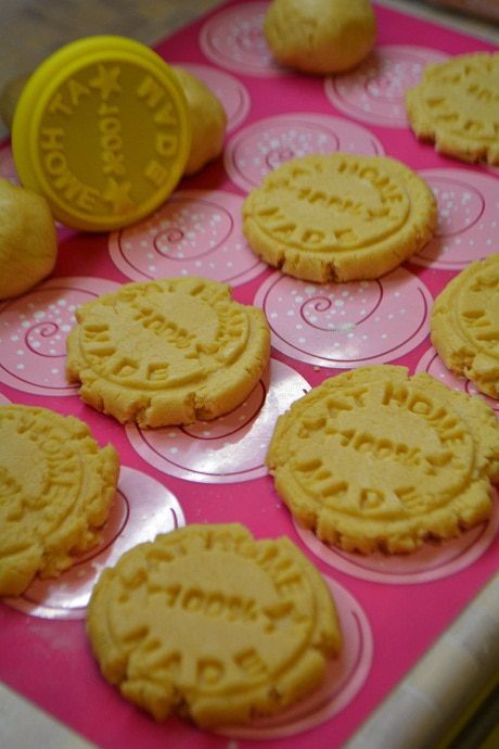 Отщипываем тесто, скатываем в шар с грецкий орех и укладываем на противень выстланной пекарской бумагой или силиконовым ковриком. Придавливаем штампом (как у меня) или обычным стаканом. Выпекаем в духовке 10 минут при температуре 160°С. Ориентируемся на края печенья, как только зарумянились-готовы.
