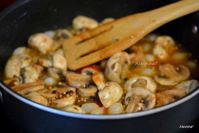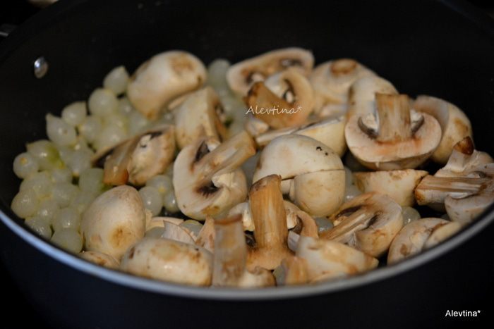 Добавить свежие шампиньоны очищенные, крупные желательно нарезать. Готовить 2 мин.