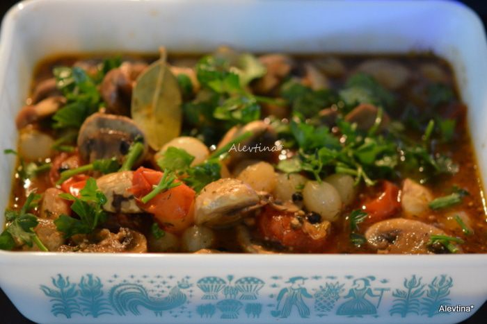 Добавить вино, воду, кориандр и черный перец горошком, лимонный сок, лавровый лист, тимьян. Крышкой не закрывать и тушить примерно 25 мин.