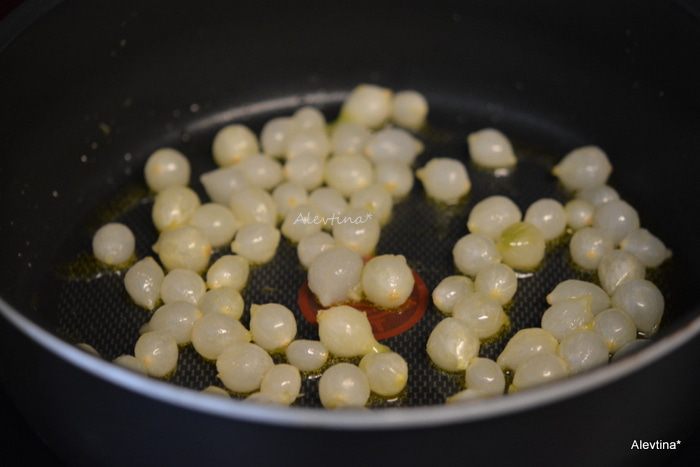 Разогреть сковороду, оливковое масло на среднем огне. Добавить жемчужный лук, обжаривать 6-8 мин (можно заменить на луковицу порезанную крупно).