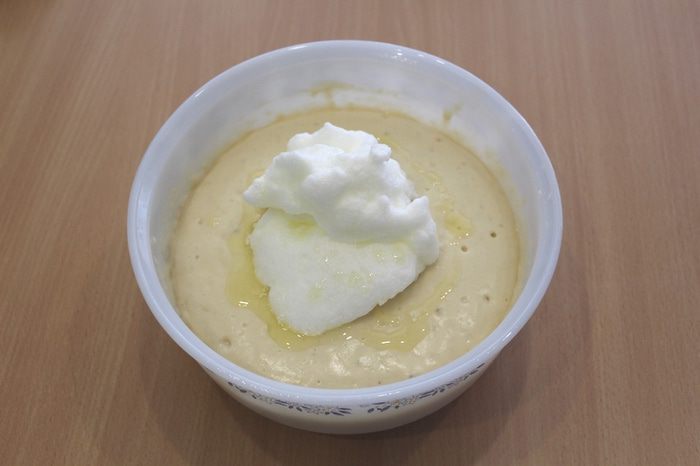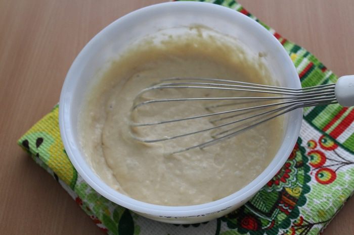 Постепенно всыпать муку, замесить густое тесто (как сметана). Накрыть и оставить в тёплом месте на 30-60 минут до увеличения объема вдвое.