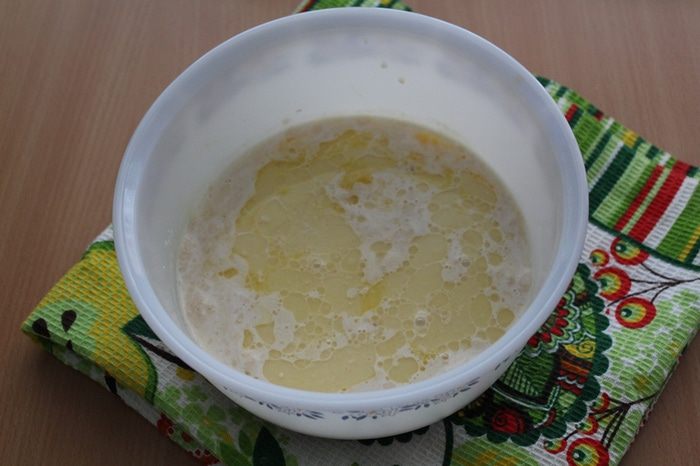 Затем влить оставшееся молоко, добавить сахар, соль, желток, масло и хорошо размешать.