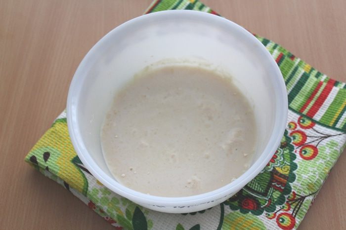 Растереть дрожжи с 1 ч. л. сахара. Добавить половину теплого молока и 1 ст. л. муки, размешать и оставить до появления пузырей на 10-15 минут.