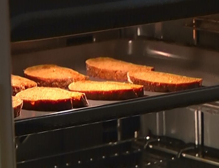 Хлеб поджарить в тостере или духовке.