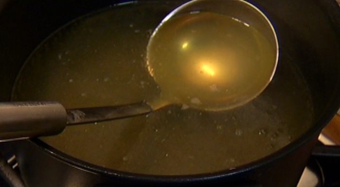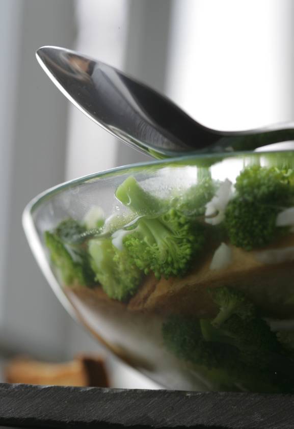 Бульон довести до кипения, посолить, поперчить, добавить брокколи и варить пару минут.