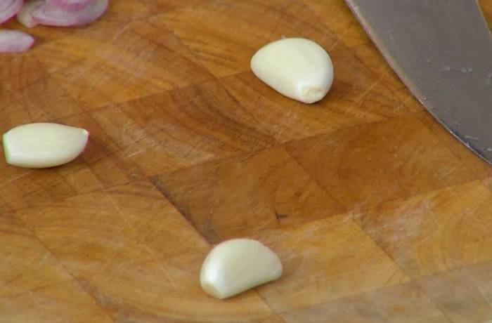 Чеснок почистить, разрезать каждый зубчик пополам и натереть поджаренный хлеб.
