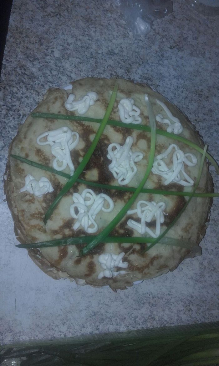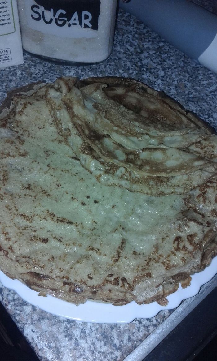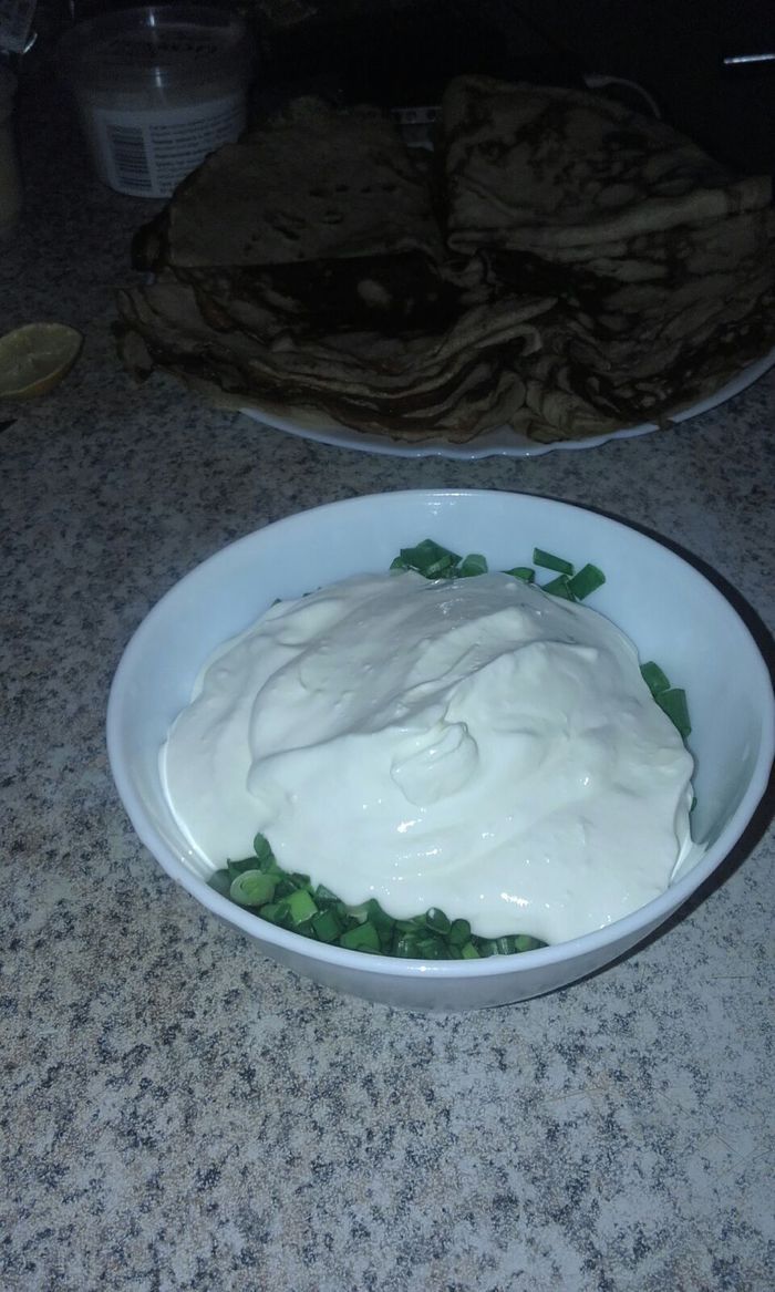 1 блин намазываем зелёным луком, смешанным со сметаной.