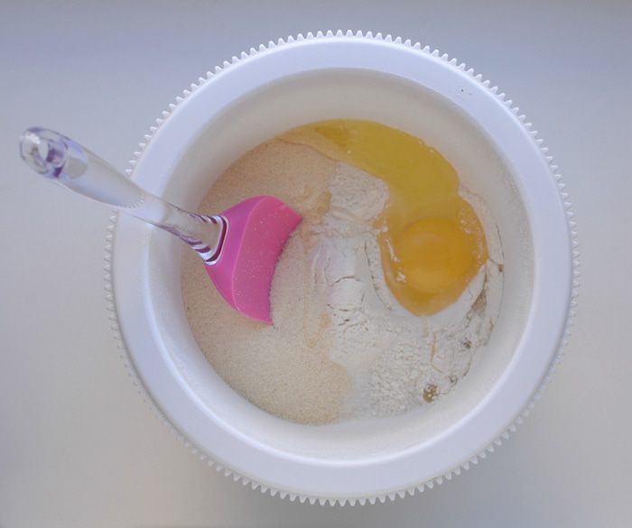 Добавить яйцо. Перемешать. Добавить теплую воду и масло. Взбить миксером. Тесто получается жидкое.