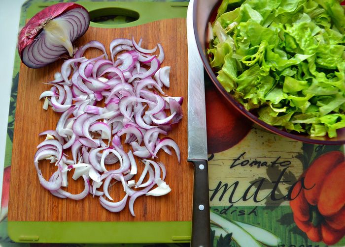 Половину красного лука нарежьте полукольцами.