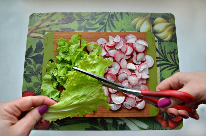 Редис нарежьте также — тонкими полу-дольками, а листья салата с помощью ножниц нарежьте полосками.