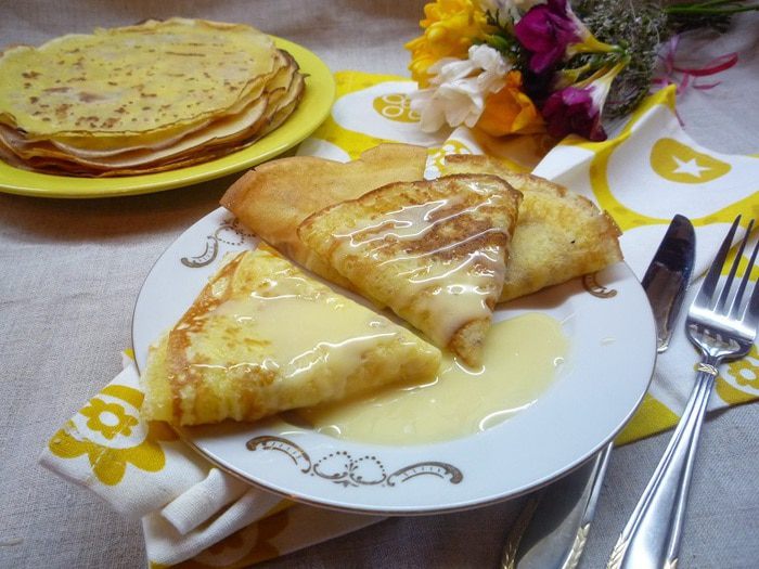 Разогреваем сковороду, смазываем растительным маслом и выпекаем тонкие, кружевные блинчики.