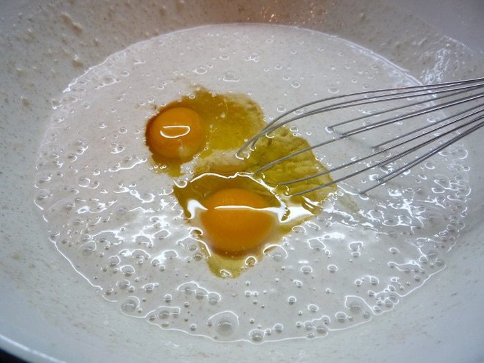 Добавляем растительное масло, яйца и снова взбиваем до однородности. Густоту теста регулируем добавлением муки или простокваши.