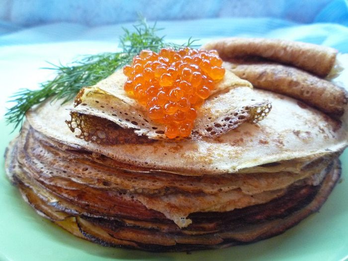 Ржаные блины с красной икрой станут вкусным и красивым украшением стола на Масленицу. Такие блины также будут хороши с рыбой, любым копченым мясом или бужениной.