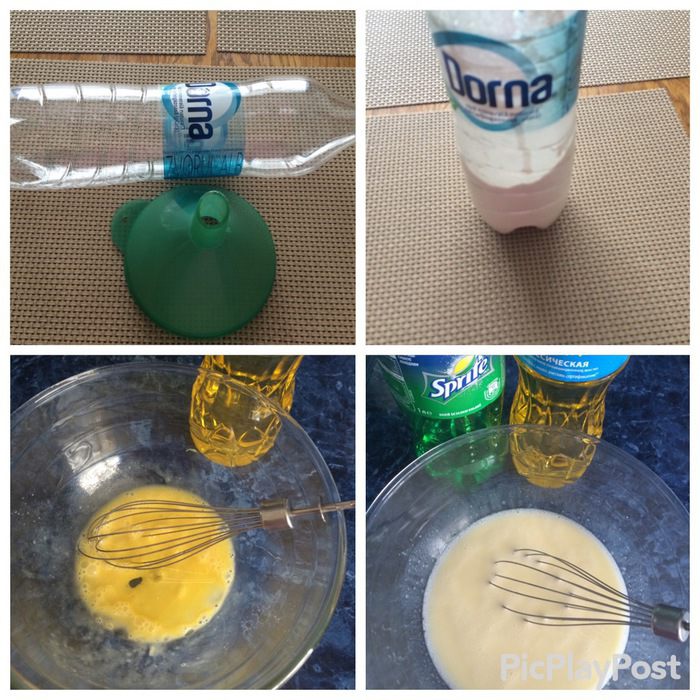 Отдельно взбить яйца, добавить подсолнечное масло, молоко и Спрайт.