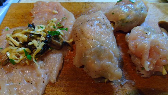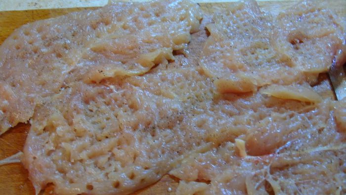 Куриную грудку нарезаем как на биточки, отбиваем, солим и перчим по вкусу.