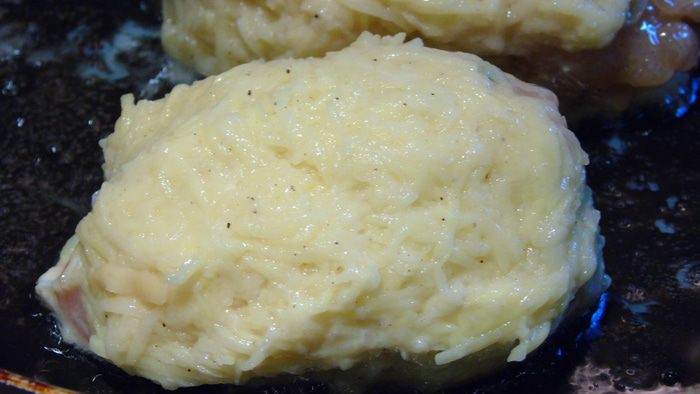 Затем раскладываем поверх котлеты картофель, прижимая руками. Картофель очень хорошо держится, и обжариваем на хорошо разогретой сковороде с добавлением растительного масла, с двух сторон до золотистости.