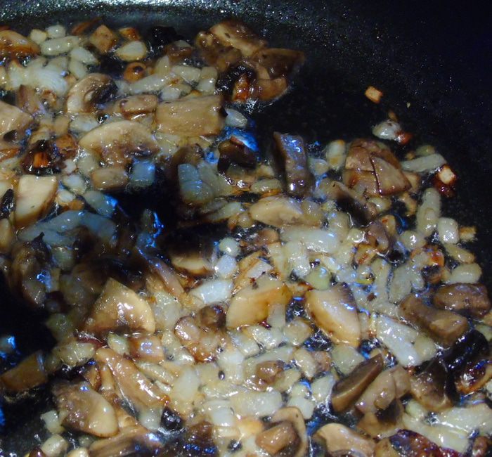 Лук и грибы нарезаем и обжариваем на разогретой сковороде на 1 ст. л. масла растительного до золотистого цвета, солим и перчим по вкусу.