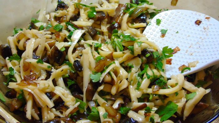 Сыр натираем на терке и смешиваем с грибами и луком, добавляем зелень, у меня петрушка.