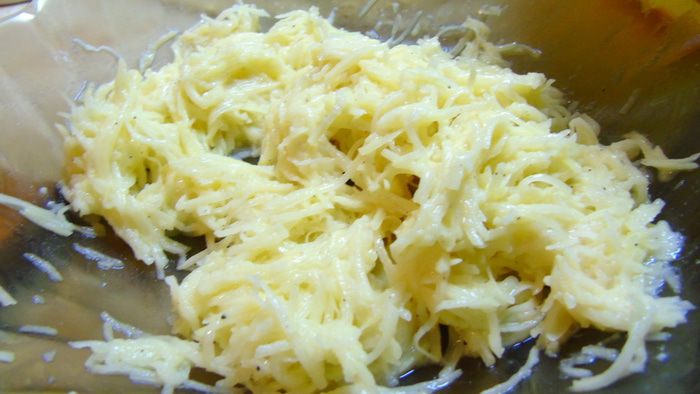 Картофель, берем крупный, очищаем и натираем на средней терке, добавляем 1 ст. л. муки, солим, перчим, перемешиваем.
