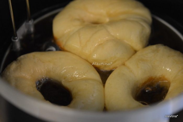 Каждый пончик окунать в глазурь. Обратно выкладывать на противень.