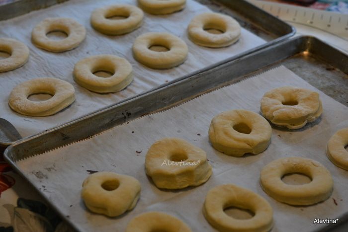 Пончики выложить на противни и дать 45 минут расстойки. За это время они поднимутся.