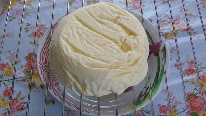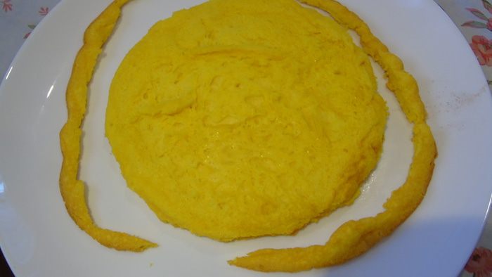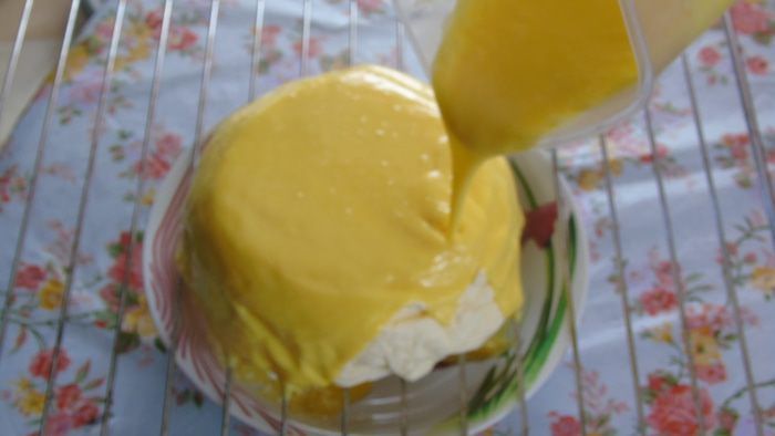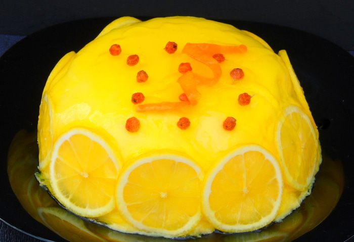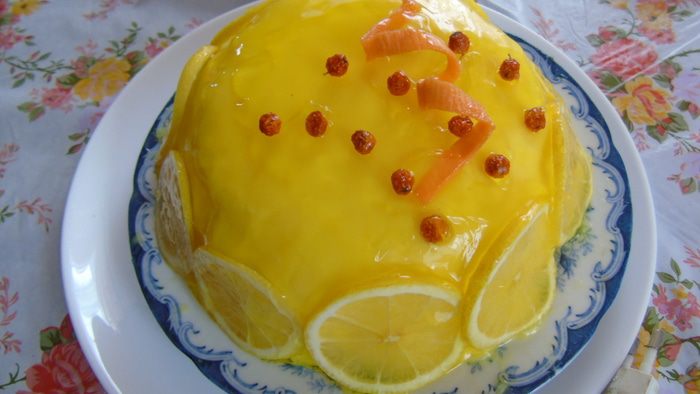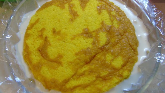 Сборка торта. Форма 16 см. У меня не было формы, я использовала стеклянную посуду предварительно застелив пленкой. Торт будем собирать сверху вниз, На дно выливаем 1/2 крема, затем кладем панна котту, выливаем оставшийся крем и сверху выкладываем бисквит, утопив его в крем. Отправляем в морозильник на 6-8 часов, лучше на ночь.