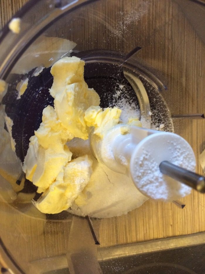 В блендере пробить мягкое масло с щепоткой соли и пудрой. Добавить белок и ещё раз пробить.