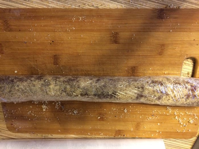 Достать скатать колбаску обвалять в орехах завернуть в пленку и оправить на 1,5 часа в холодильник.