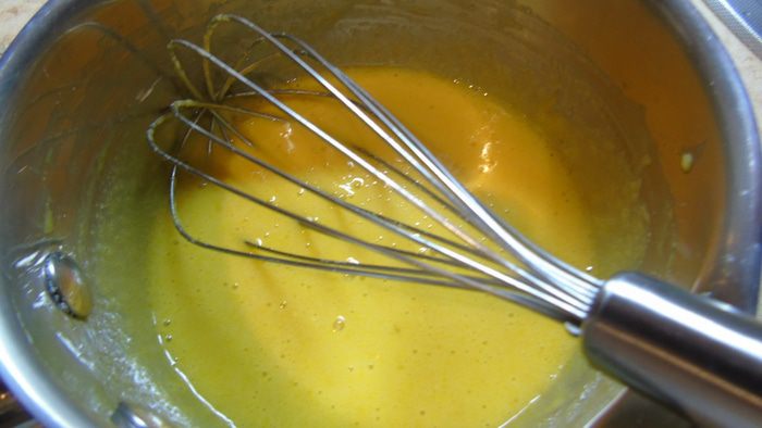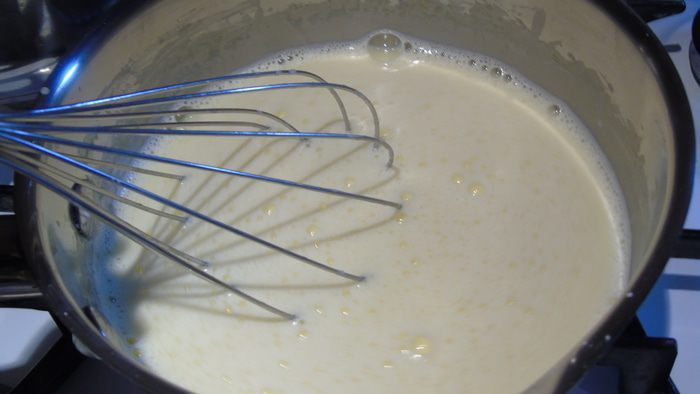 Вливаем молоко и ставим на огонь, помешивая венчиком, варим крем до загустения.