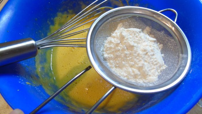 Затем все время помешивая, добавьте частями просеянную муку.